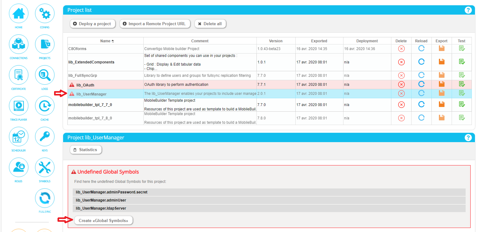 You have to configure project lib_UserManager . To do so go to convertigo admin console: http://my.dns.name/convertigo/admin/login.html and type login and password. Then, click on project on the left hand side to access to project list view. On the left side of lib_UserManager and C8Oforms projects, you will se a red warning icon, click on it to create symbols.