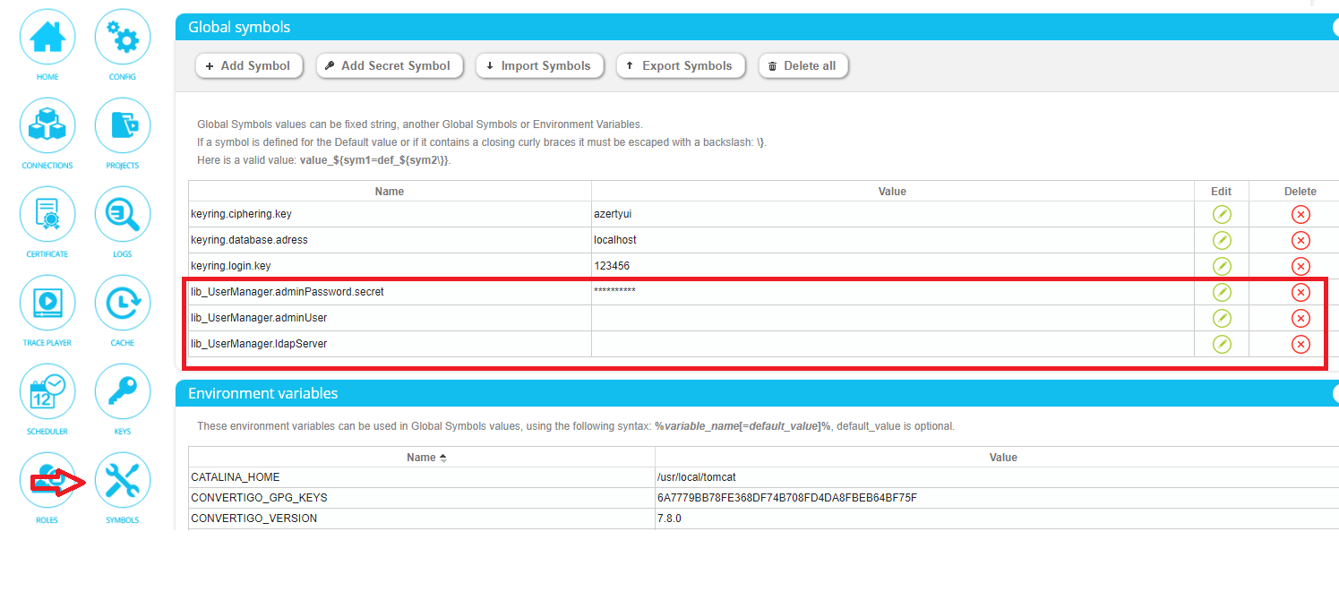 To do this, Go to Convertigo administration, into symbols section, and create the following symbols: