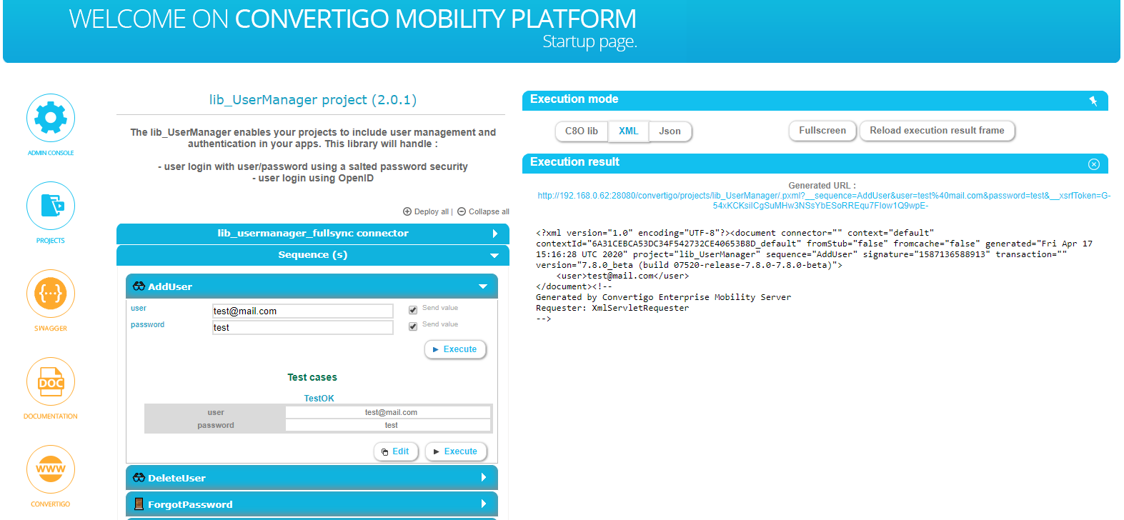 Go to convertigo administration and login, then navigate to test platform, and click on lib_UserManager, execute sequence AddUser with user email and password.