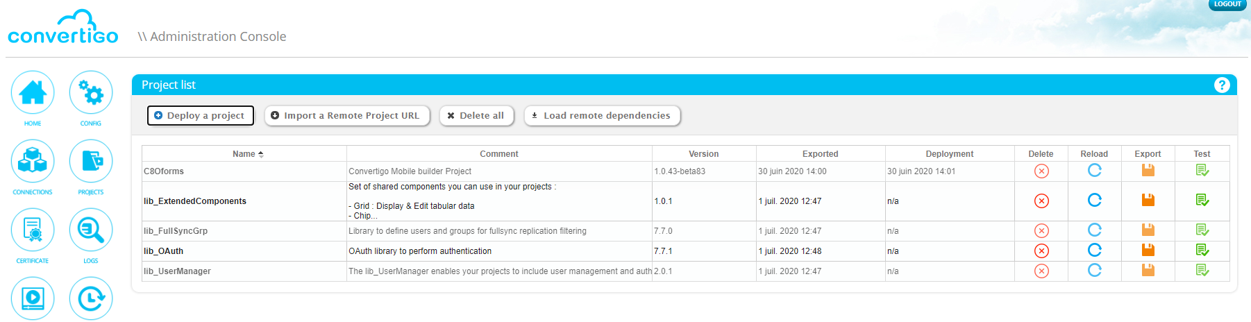 - Administration url: http://my.dns.name/convertigo/admin/main.html